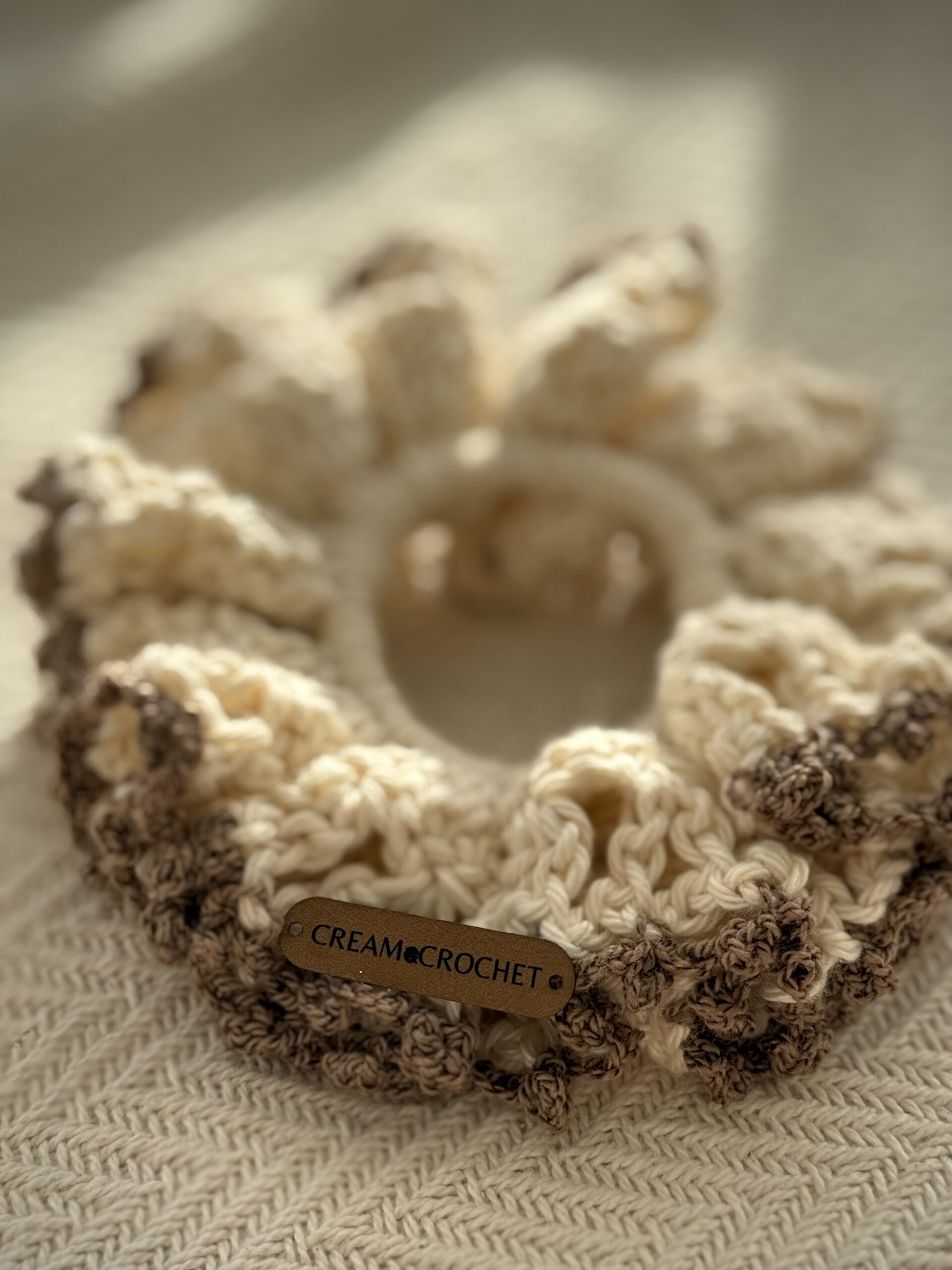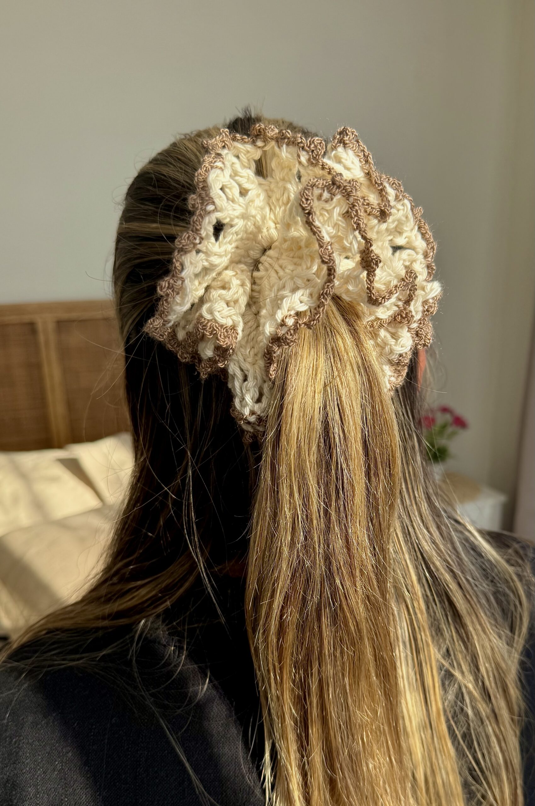 Scrunchie tejido a mano en tonos crema y café suave, ideal para complementar cualquier look con un estilo elegante y atemporal. Cómodo, delicado y perfecto para uso diario.