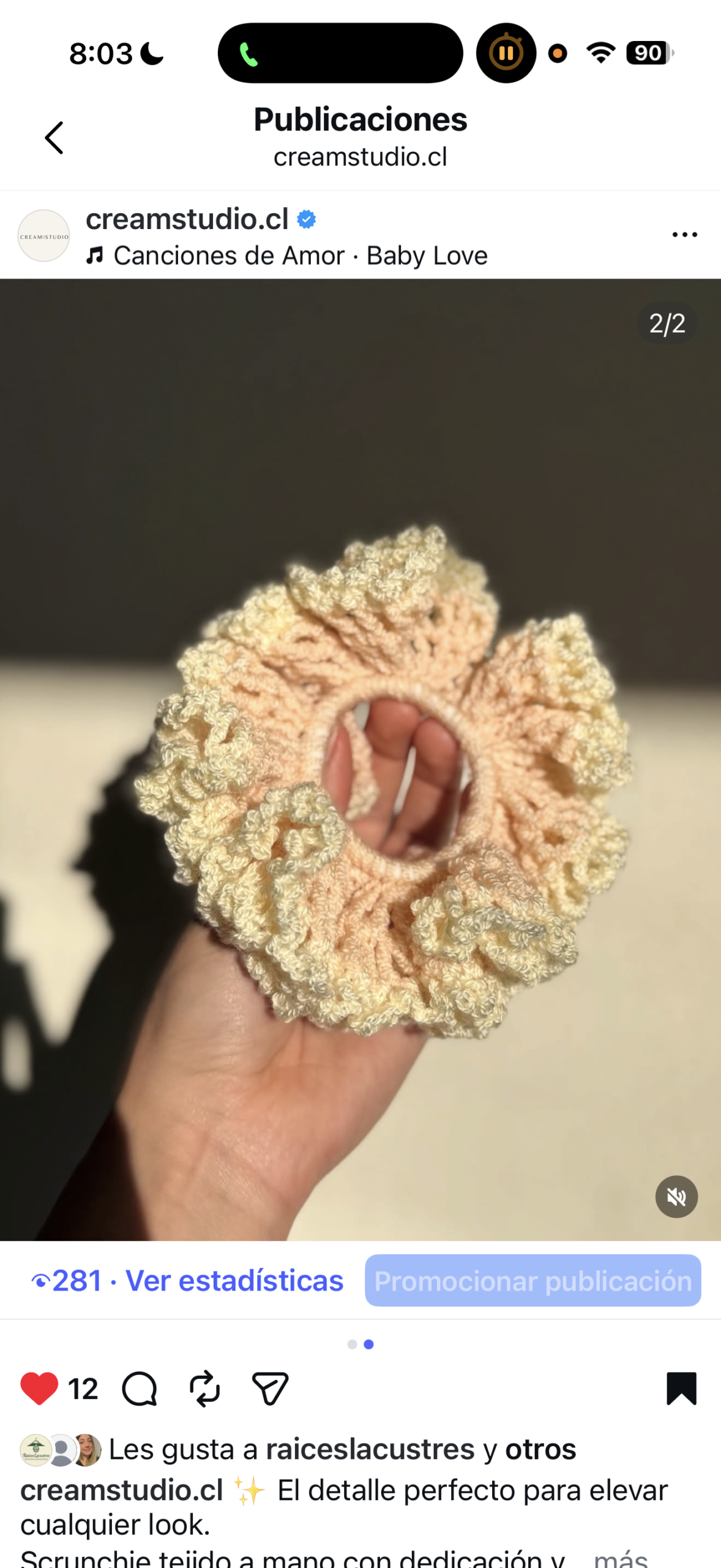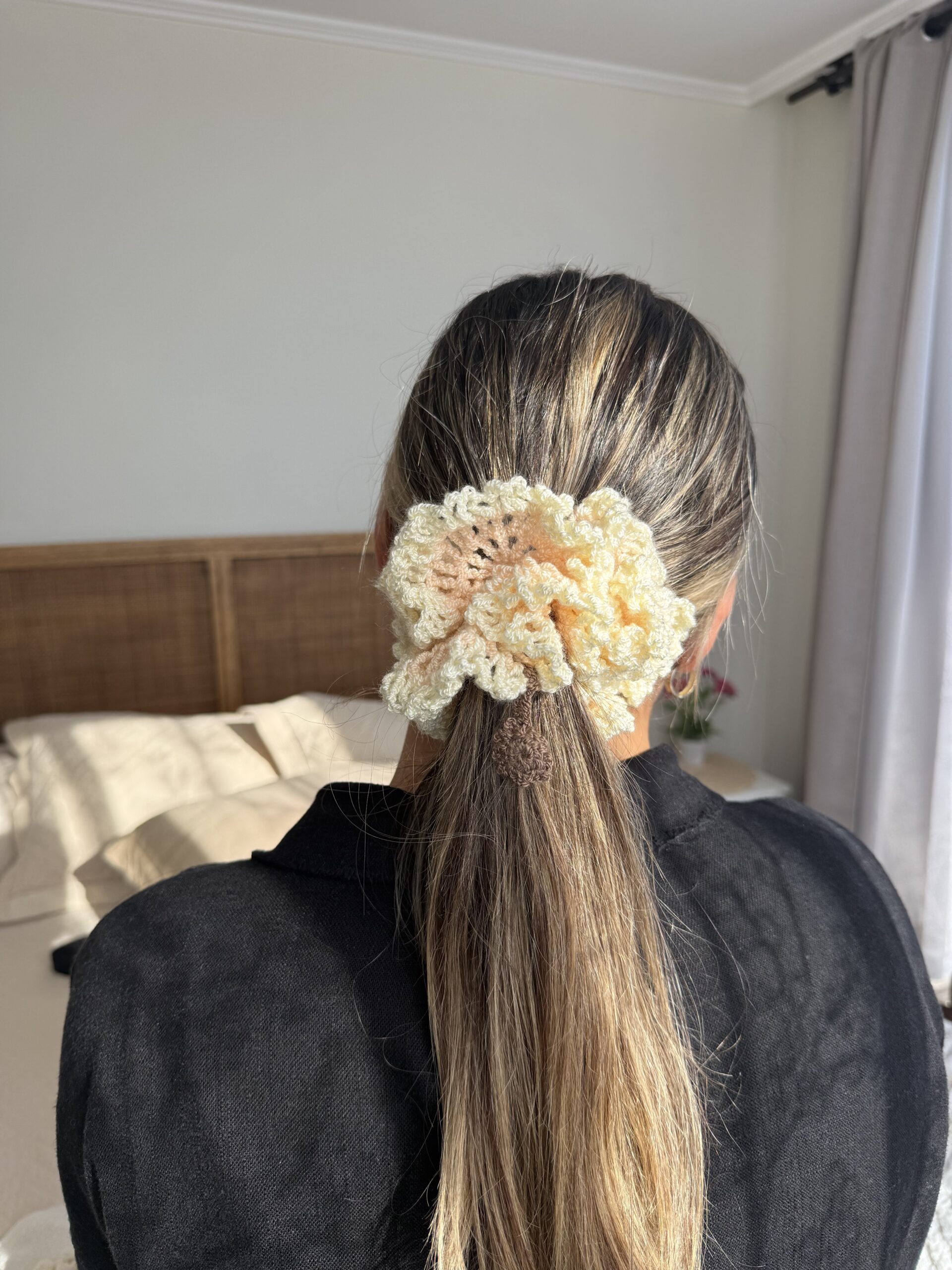 Scrunchie tejido a mano en tonos suaves crema y vainilla. Un diseño delicado y femenino que aporta luz y elegancia a cualquier look. Cómodo, liviano y perfecto para uso diario.